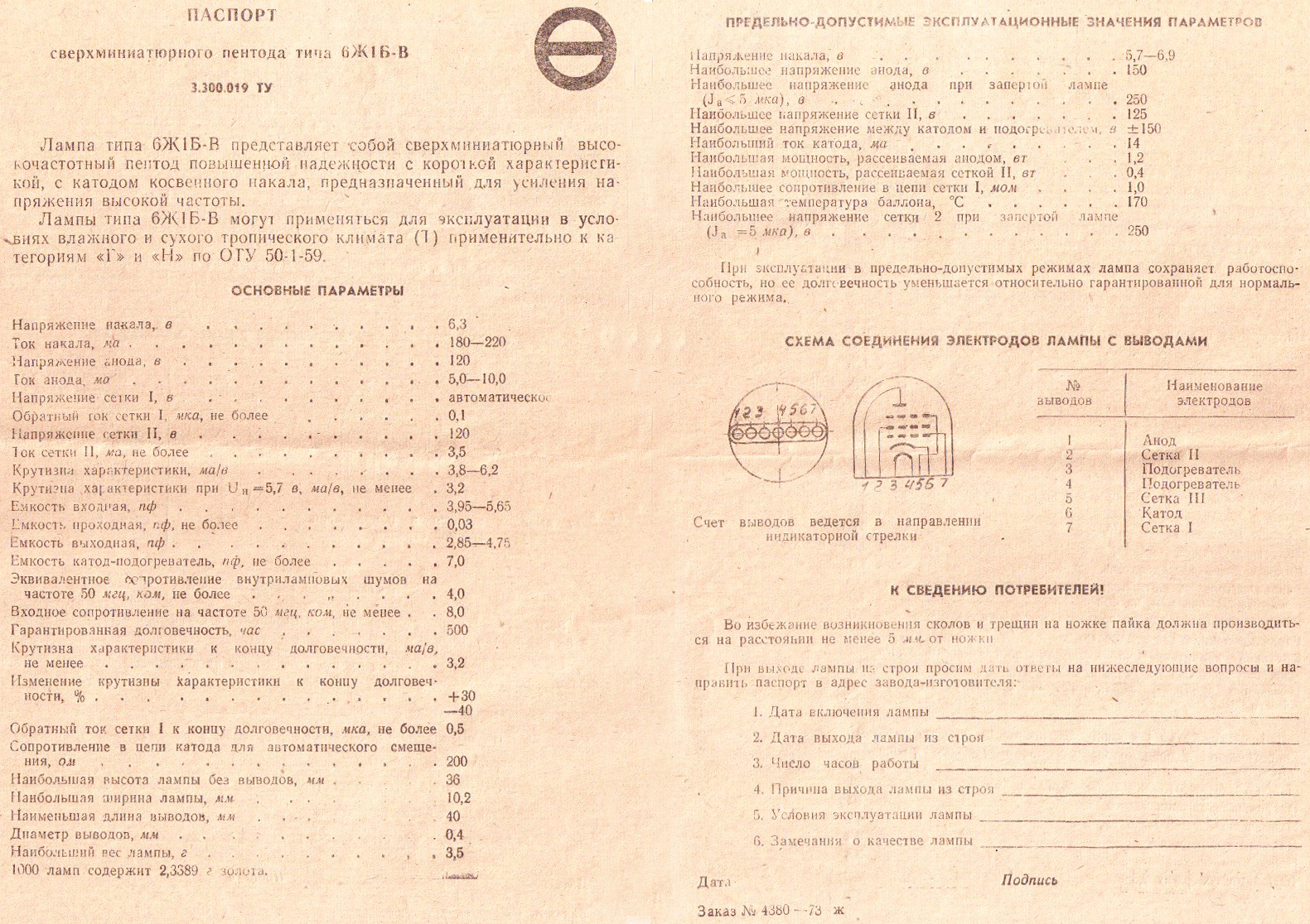 | Наименование | 6Ж1Б-В Пентод, выводы в ряд |