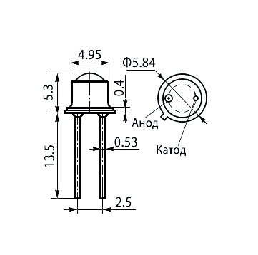 | Наименование | 3Л341И Светодиод выводной красный Ø 5mm 2V(Вольт) 30mA(Миллиампер) 0,3mCd(Милликандел) 20градусов, Au, аА0.339.189 ТУ |