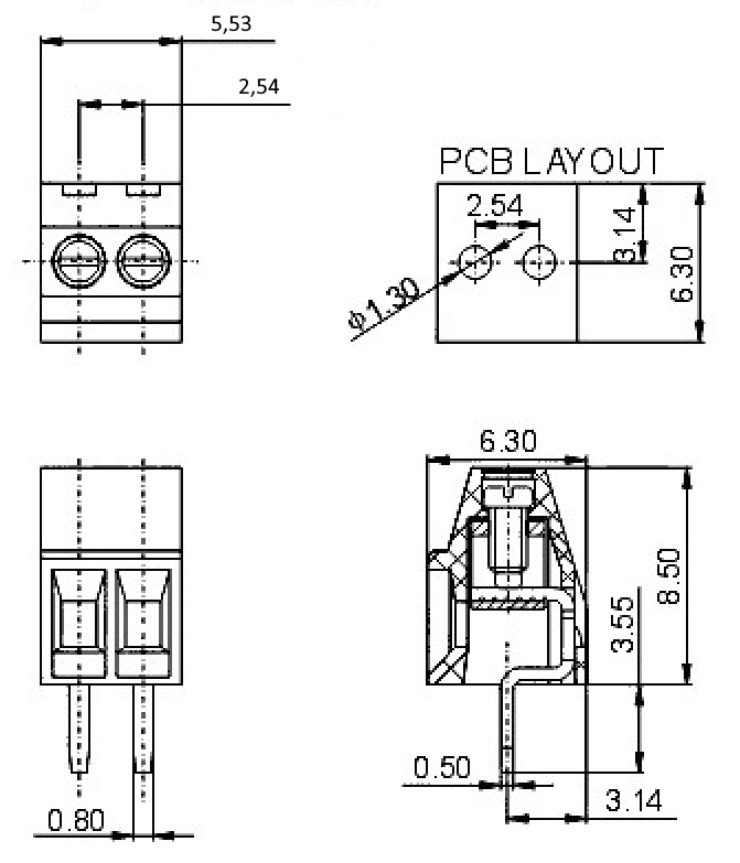 | Транслитерация | GT308-2.54-02P-14-00 6A(Amp) 150V(Volt) 2 contacts pitch 2.54mm 1 row of contacts Screw terminal block, on the board, GOLTEN |