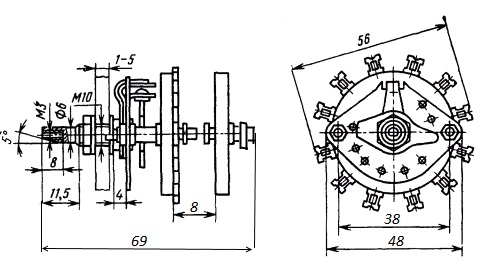 Наименование | ПГК-11П2Н-8 11 положений 2 направления 3A(Ампер) 350V(Вольт) вал ОС-6 (гладкий с конической лыской с резьбой) Переключатель галетный, УС0.360.059 ТУ |