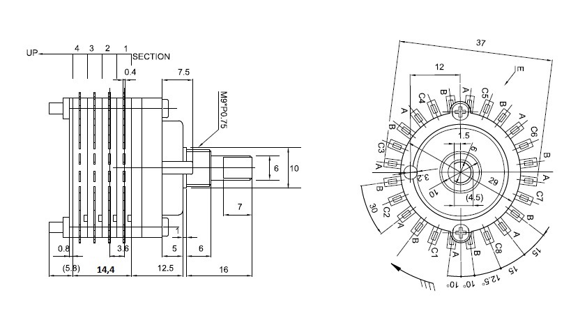 | Наименование | RCL371-4-16-2-16F 2 положения 16 направлений 0,5A(Ампер) 30V(Вольт) вал 16mm (F - гладкий сплошной с прямой лыской) Переключатель галетный. |