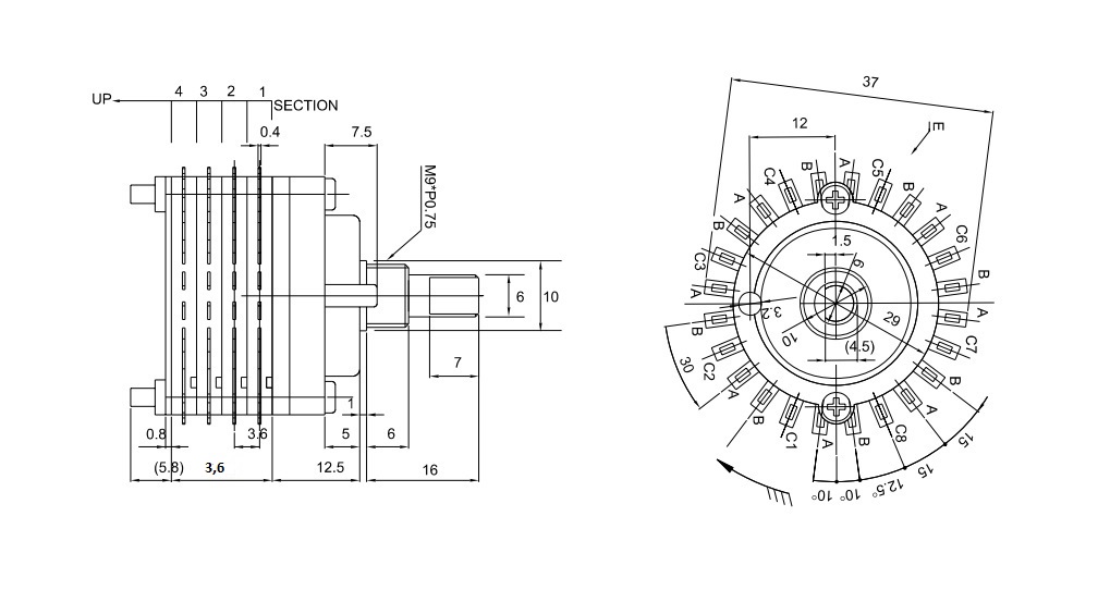 | Электрическая схема контактов галетных переключателей | 12 положений 1 направление |