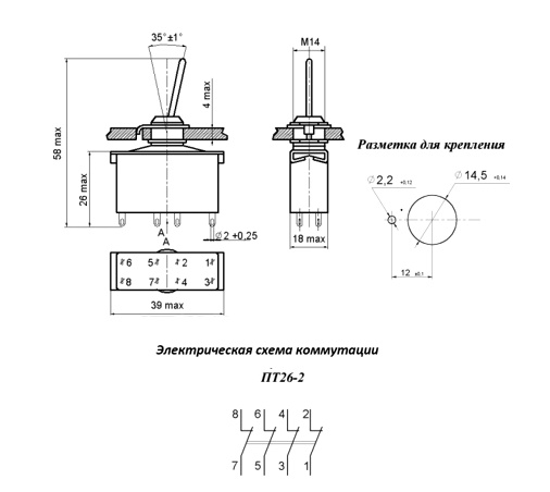 | Транслитерация | PT26-2 on-off, 5A (Amps) 250V (Volts) Four-pole toggle switch, soldering, AG0.360.219TU, plastic |