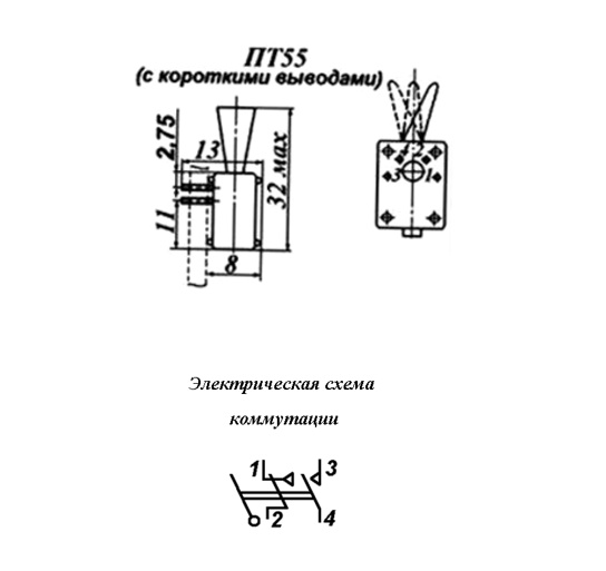 | Транслитерация | PT55-4V on-(on), 0.5A (Amps) 250V (Volts) Two-pole micro toggle switch, soldering, AG0.360.042TU |