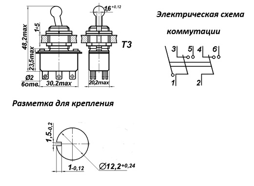 | Наименование | Т3 on-on, 6A(Ампер) 250V(Вольт) Тумблер двухполюсный, пайка, ВР0.360.007ТУ |