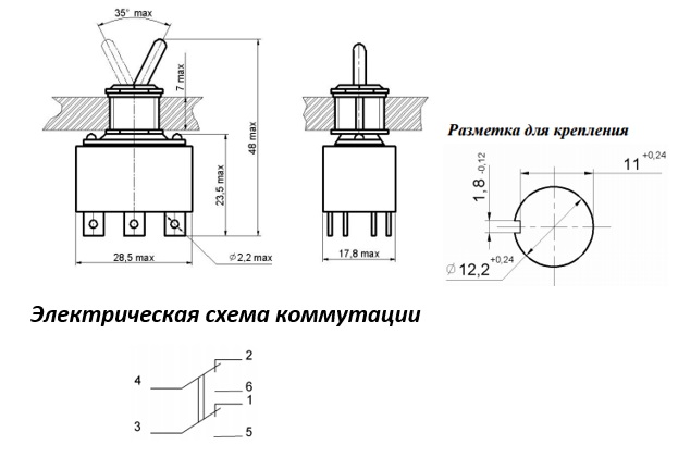 | Электрическая схема коммутации | полож.1 (1-3; 2-4); пол. 2 (3-5; 4-6) |