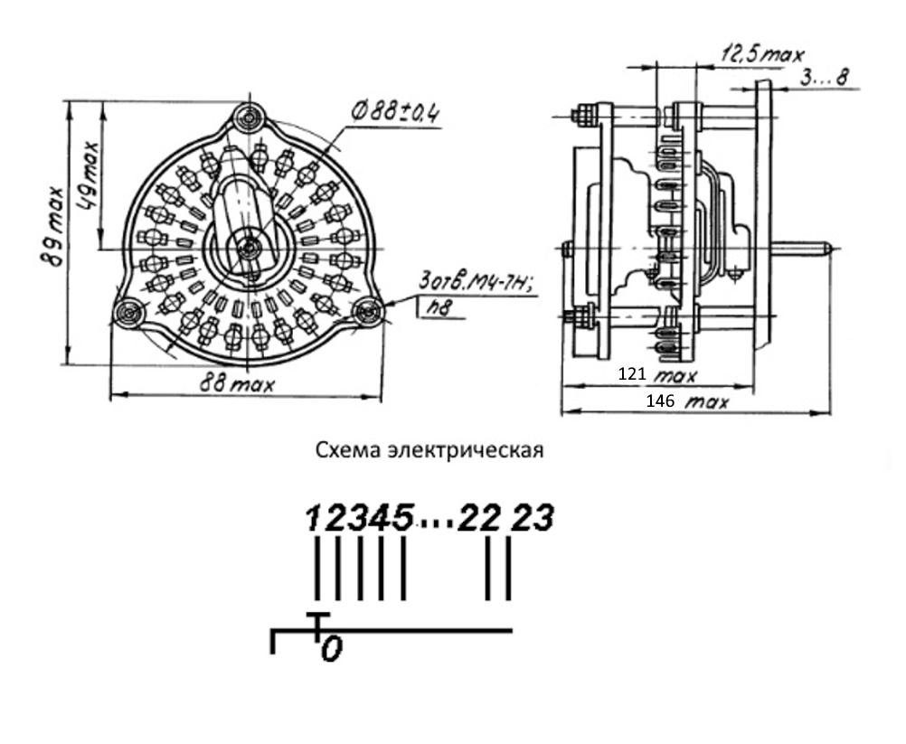 | Наименование | ПЩ-23П4Н1В 23 положения 4 направление 0,5А 220В Переключатель щеточный. АГ0.360.417 ТУ. |