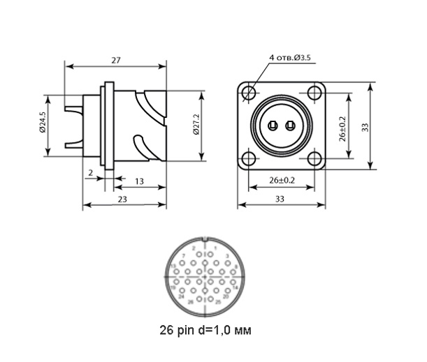 | Сочетание контактов | 26 контактактов Ø 1 mm |