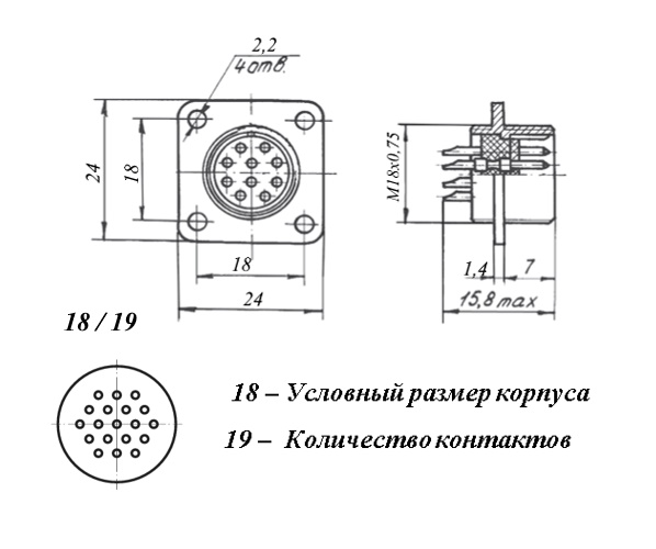 | Диаметр контактов | 19 - Ø 1 mm |