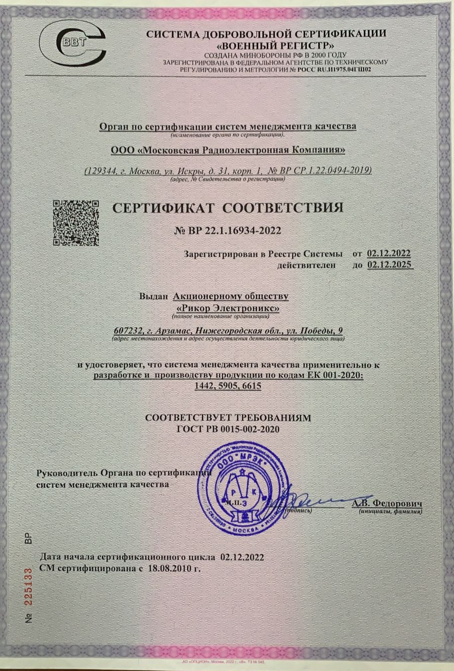 | Нормы и требования | ГОСТ РВ 0015-002-2020 |
