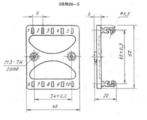 | Транслитерация | 3PM20-5 5 pairs, 2 rows, 10 contacts, 9mm pitch, 5A(Ampere) 1000V(Volt) Mounting plate, carbonite GOST 28821-90. |