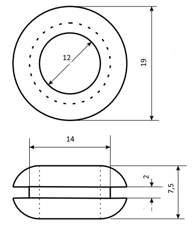 | Наименование | Втулка 12х19х14х7,5х2 проходная черная, резина EPDM, Ruichi. |