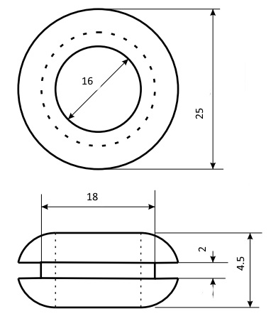 | Наименование | Втулка 16х25х18х4,5х2 проходная черная, резина EPDM, Ruichi |