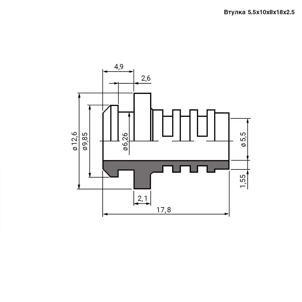 | Наименование | Втулки 5,5х10х8х18х2,5 проходная черная, резина EPDM, Ruichi. |